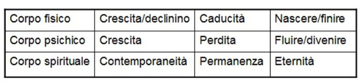 Siamo anche corpo spirituale e come tale dovremmo sperimentare lo scomparire del tempo. Quindi in noi sperimentiamo un nascere e un finire, un divenire e un eterno. Secondo dove la nostra attenzione si polarizza potremmo avere il senso di caducità, la sensazione che tutto passa e non torna (ogni lasciata è perduta), o il significato della sincronicità, della contemporaneità.