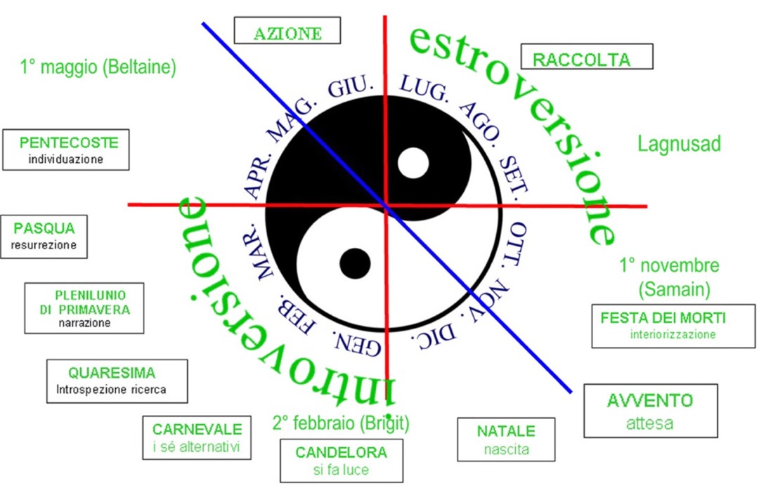 Il momento successivo con la festa dei morti ci riporta nella parte oscura dell’anno, il periodo d’introversione, il momento di pausa. Dopo questa festa non si facevano più raccolti. E’ un periodo di gestazione in cui così come non si rimuove il seme per osservare il suo sviluppo si vive un tempo d’attesa perché dalle oscurità del nostro inconscio nasca una nuove vita: siamo a Natale, il giorno da questo momento comincia a crescere.