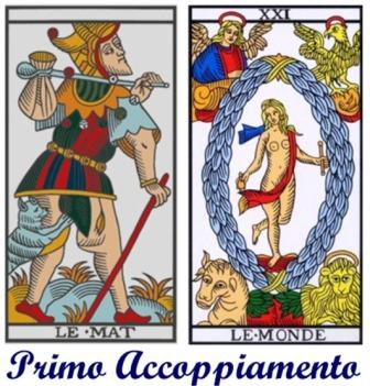 Il Matto è l’unica carta che non possiede un numero e che, teoricamente, può prendere qualsiasi posto. Il Mondo è l’XXI carta. Se li poniamo in relazione abbiamo due possibilità come evidenziato dalla figura successiva.